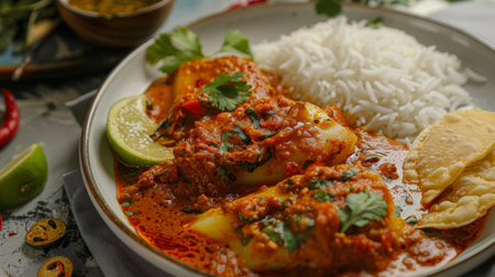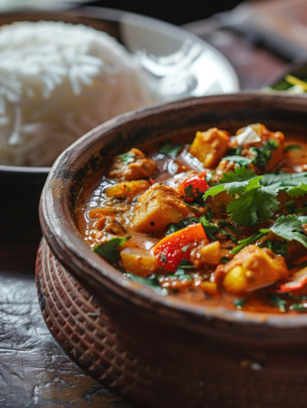 A close-up of a spicy and fragrant Indian curry, simmered to perfection in a traditional clay pot and served alongside fluffy basmati rice, showcasing the bold flavors and authentic of Indian cuisine