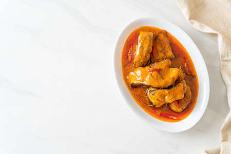 Redtail Catfish Fish in Dried Red Curry Sauce that called Choo Chee or a king of curry cooked with fish served with a spicy sauce