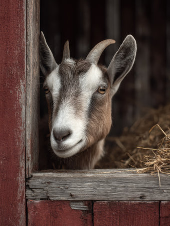 Goat looks curiously from the doorway of a rustic barn, surrounded by straw, showcasing a peaceful moment on a farm in the countryside.