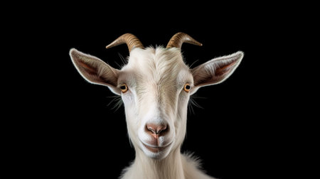 Portrait of a white goat with horns isolated on a black background