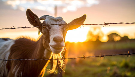 A friendly goat with a curious expression peeks over a barbed wire fence during a beautiful golden hour sunset. The warm light illuminates the rural farm scene, creating a peaceful and idyllic atmosphere of country living.