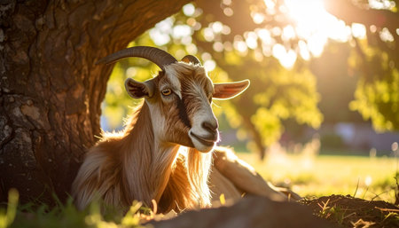 As the day draws to a close, a gentle goat finds a moment of perfect tranquility resting in the shade of an old tree. The warm, golden sunlight filters through the leaves, creating a serene and idyllic scene of peaceful country living and harmony with nature.