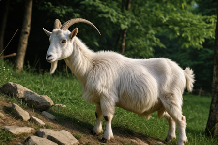 white mountain wild goat stands at rock at forest background. female