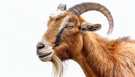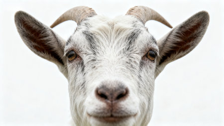 A close up picture of a curious young goat on a white background. Generative AI