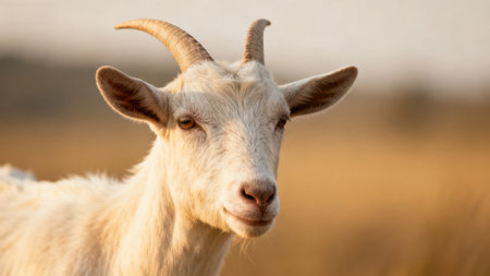 The goat gazes curiously, showcasing its large amber eyes and soft fur. Background features warm tones from foliage, creating a serene, rustic atmosphere during daylight.