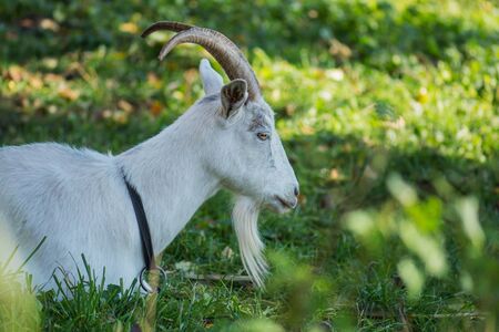Goat on the grass in the yard. White goat with horns