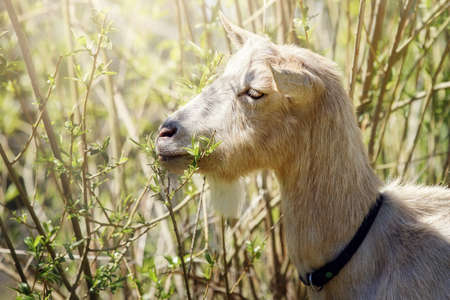 The goat likes young juicy bush twigs. The animal with closed eyes, satisfied sniff with the delicacy.