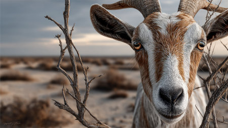 A striking close-up of a goat featuring detailed facial expressions and unique coloring, set against a soft desert backdrop during twilight.