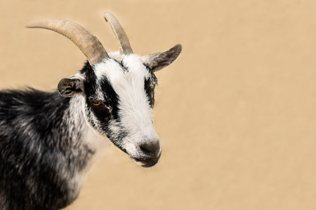 Close-up portrait of a domestic goat. goat looking at the camera
