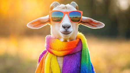 Goat wearing colorful scarf and sunglasses enjoying sunny outdoor setting. Concept of fun animal portrait highlighting unique fashion and joyful personality, funny animal.