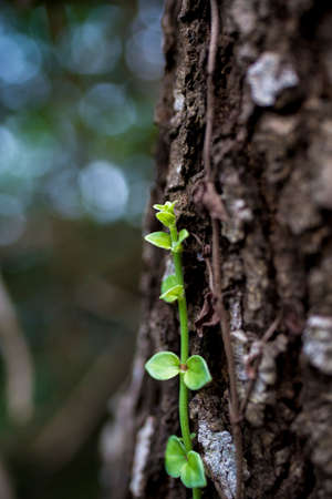 green plant grows up the bark from a tree in the nature