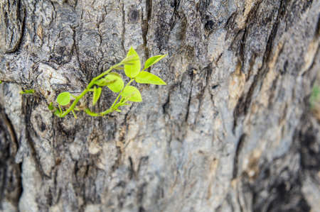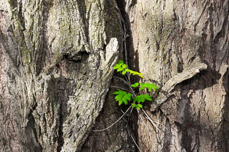 Green ivy leaves on an old cracked trunk of tree.