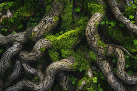 The plants and vines that are intertwined with the green mosaic on the tree are a beautiful landscape