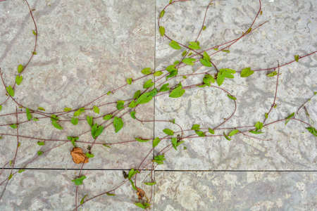 The texture of white nature stone marble floor or wall with some plants of ivy. White marble or granite floor with vines as nature background