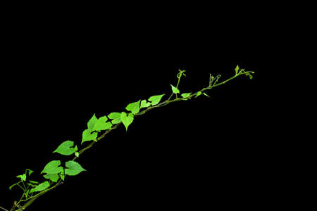 A close-up captures a slender vine with bright green leaves and delicate tendrils extending outwards. The leaves exhibit detailed texture and variation in tone, set against a solid black background. This image highlights natural growth and form, suitable for various editorial and design applications.