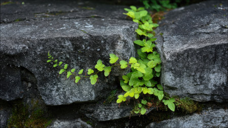 Green plant growing on a stone wall in the garden. Nature background