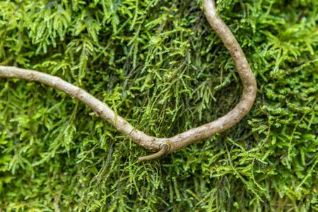 Close up selective focus. A branch of aerial root against the background of lush wet green moss. National Park Anaga, Tenerife, Spain.
