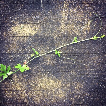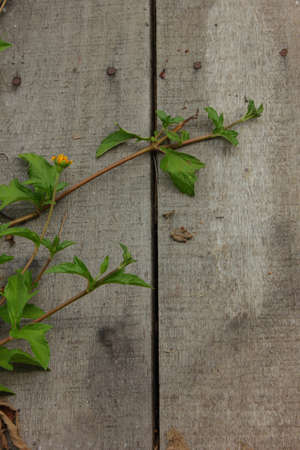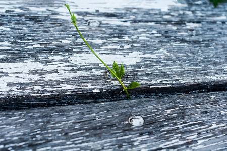 Cracked from old age wooden boards with peeling paint and green grape seedlings sprouted between the boards