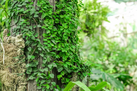 many green ivy leaves wrapping tree trunks and earth in a green botanical garden in spring. Template for design. Copy space.
