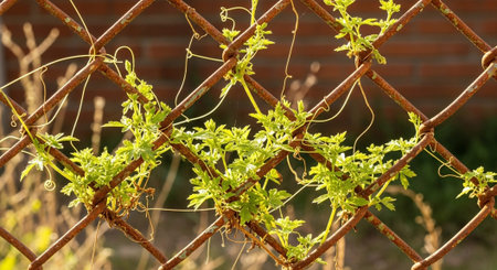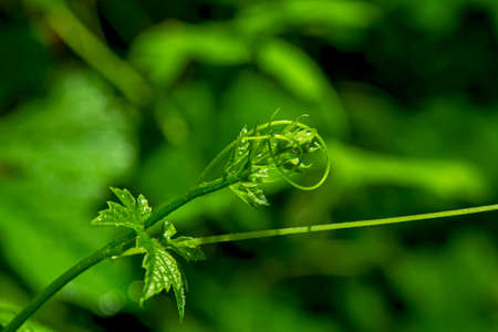 Climbing vine plant with curling tendrils and fresh green leaves growing in tropical garden with blurred background