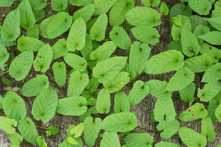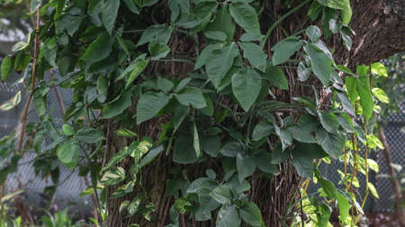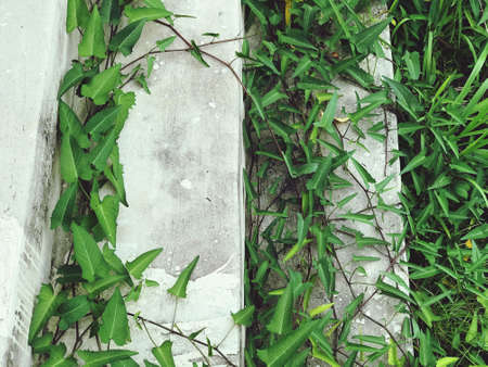 Lush curly ivy throughout the year. Leaves along the wall side, background wall, cement. Copy space. Ivy gourd .