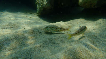 Striped red mullet or surmullet (Mullus surmuletus) undersea, Aegean Sea, Greece, Halkidiki