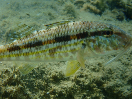 Striped red mullet or surmullet (Mullus surmuletus) close-up undersea, Aegean Sea, Greece, Halkidiki