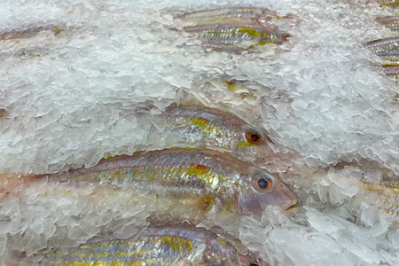 Frozen ice-cold fish rams in the store Frozen fish. Freshfish market. Gilt-head bream. Sea bream fish on ice. Fresh fish on ice for sale at market.