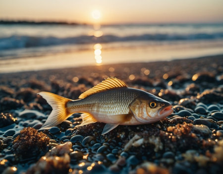 A fish rests on the sandy beach, surrounded by small stones and shells, while ocean waves quietly break in the background, highlighting the distressing issue of marine life decline.
