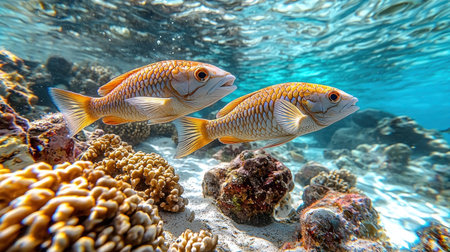 Two golden fish swim gracefully in clear turquoise water, above a vibrant coral reef. Sunlight filters through the surface, creating a serene underwater scene.