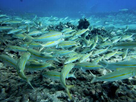 Large school of yellow snapper on a tropical coral reef in Thailand