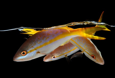 Three yellow tail snappers underwater on black background