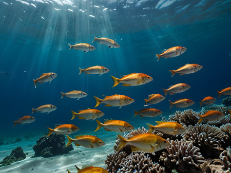 Shoal of colorful tropical fish swimming in crystal-clear water, showcasing vibrant hues and intricate patterns