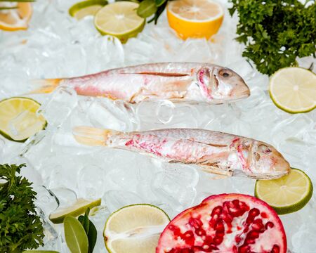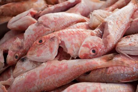 Fresh red mullets on ice in a basin