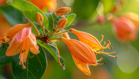 Close-up of delicate orange honeysuckle flowers with drooping petals and visible stamens on a branch with green leaves and bokeh.