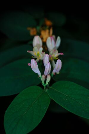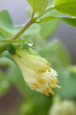 Italium Woodbine or Goat-leaf Honeysuckle, Lonicera caprifolium, flowers and buds with raindrops macro, selective focus, shallow DOF