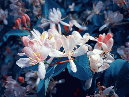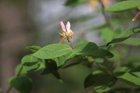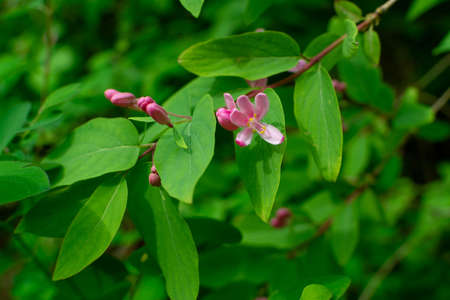 Macro shot of Lonicera tatarica or Italian woodbine with small pink flowers on blurred background. Tatarian honeysuckl flower closeup with selective focus