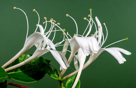 Beautiful Blooming white decorative honeysuckle on a green background. Flower head close-up.