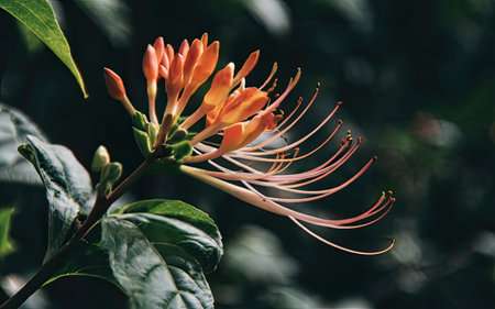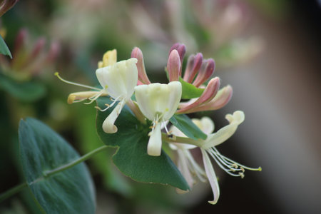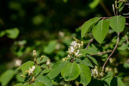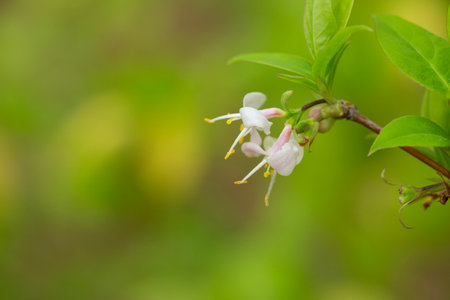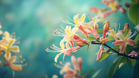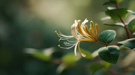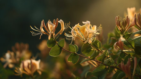 Delicate honeysuckle blossoms illuminated by soft sunlight in a lush garden during late spring