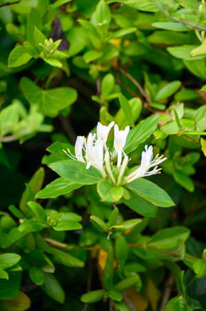 Honeysuckle white flowering bush, plant, dark green, sharp shadows, contrast, background asset