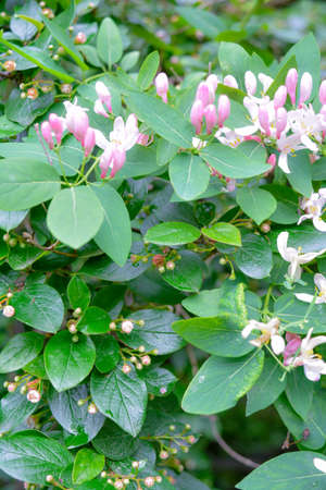 Delicate white and pink flowers of the Tatar honeysuckle ornamental shrub in close-up