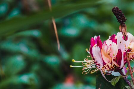 Close up of pink honeysuckle (Lonicera L.) flowers. Polish nature in summer, floral and gardening concept. Copy space, nature background.