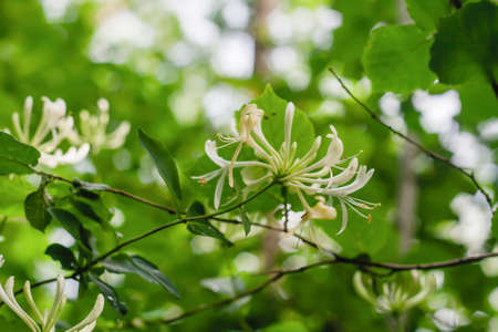 Fragrant Honeysuckle on a branch, selective focus.