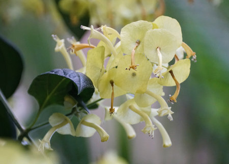 Lonicera periclymenum flower, common names honeysuckle, common honeysuckle, European honeysuckle or woodbine, blooming in summer season in garden. Soft focus.
