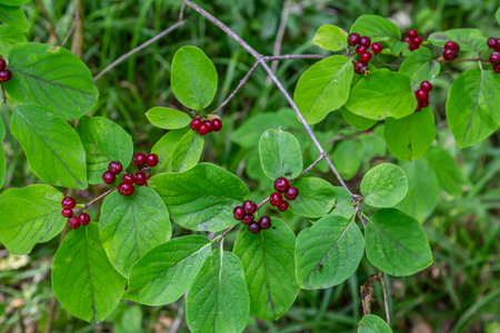 Holiday Honeysuckle Branch with Red Berries Lonicera xylosteum.