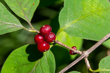 Honeysuckle Branch with Red Berries Lonicera xylosteum.