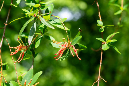 native Australian Lonicera honeysuckle firecracker plant outdoor in sunny backyard shot at shallow depth of field