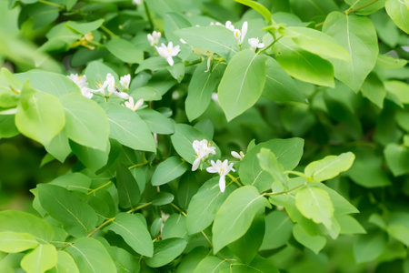 Many white flowers in the leafage of Lonicera maackii in June