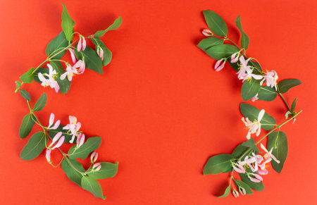 Spring flower composition. Frame of green branch with delicate pink flowers on a red background. Top view, flat lay, place for text, copy space.