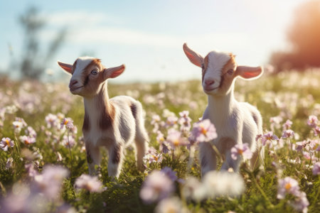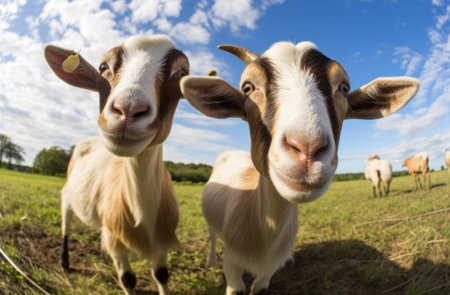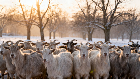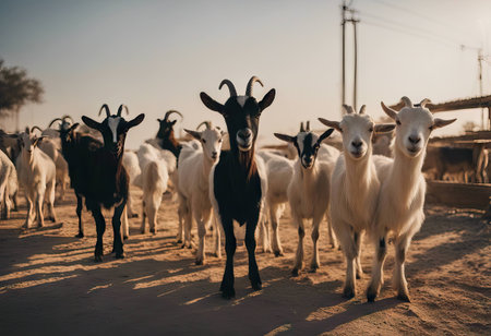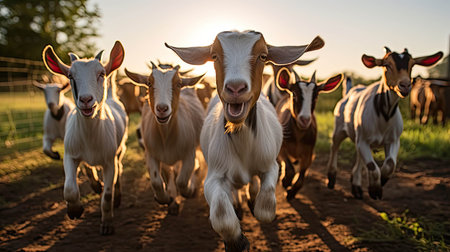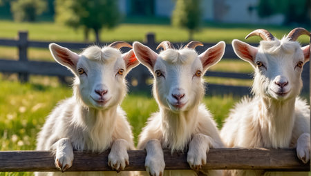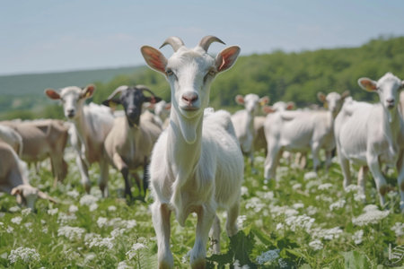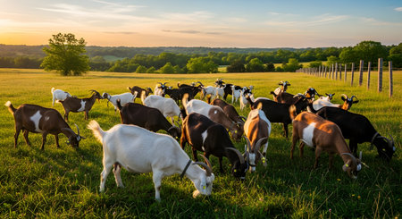 A majestic herd of goats standing proudly on a lush green field, surrounded by fresh grass and vibrant nature.